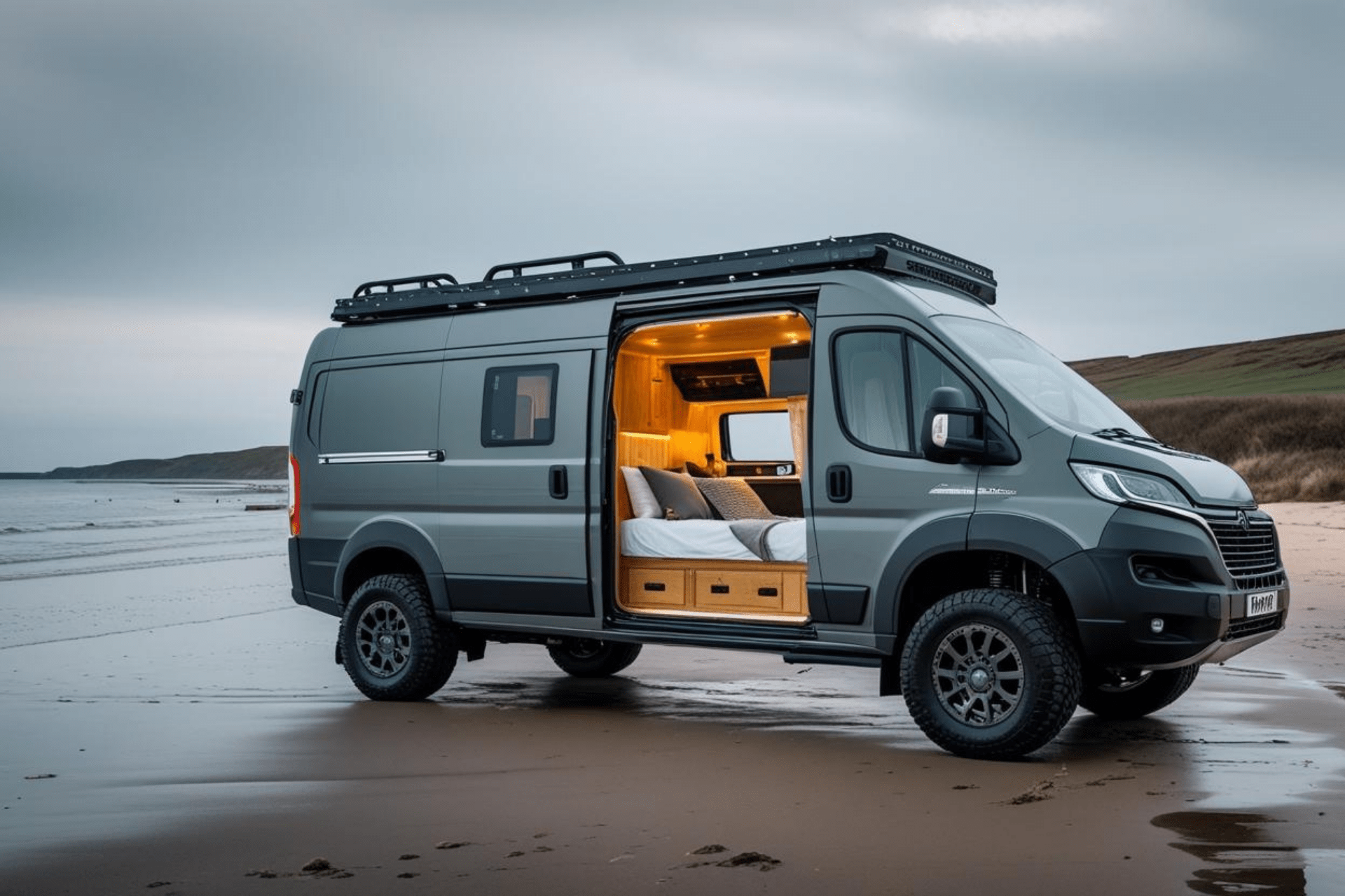 • Includes: Plumbed water, Shower, Hot water, Heating, Sink, Gas, Hob, Oven, Bed, Fixed Bed, Seating area, Table, Fridge, Storage, Overhead lockers, fixed Lighting, Mood lighting, Battery, Batteries, Solar, Power Inverter, Extractor fan, Roof vent, TV
